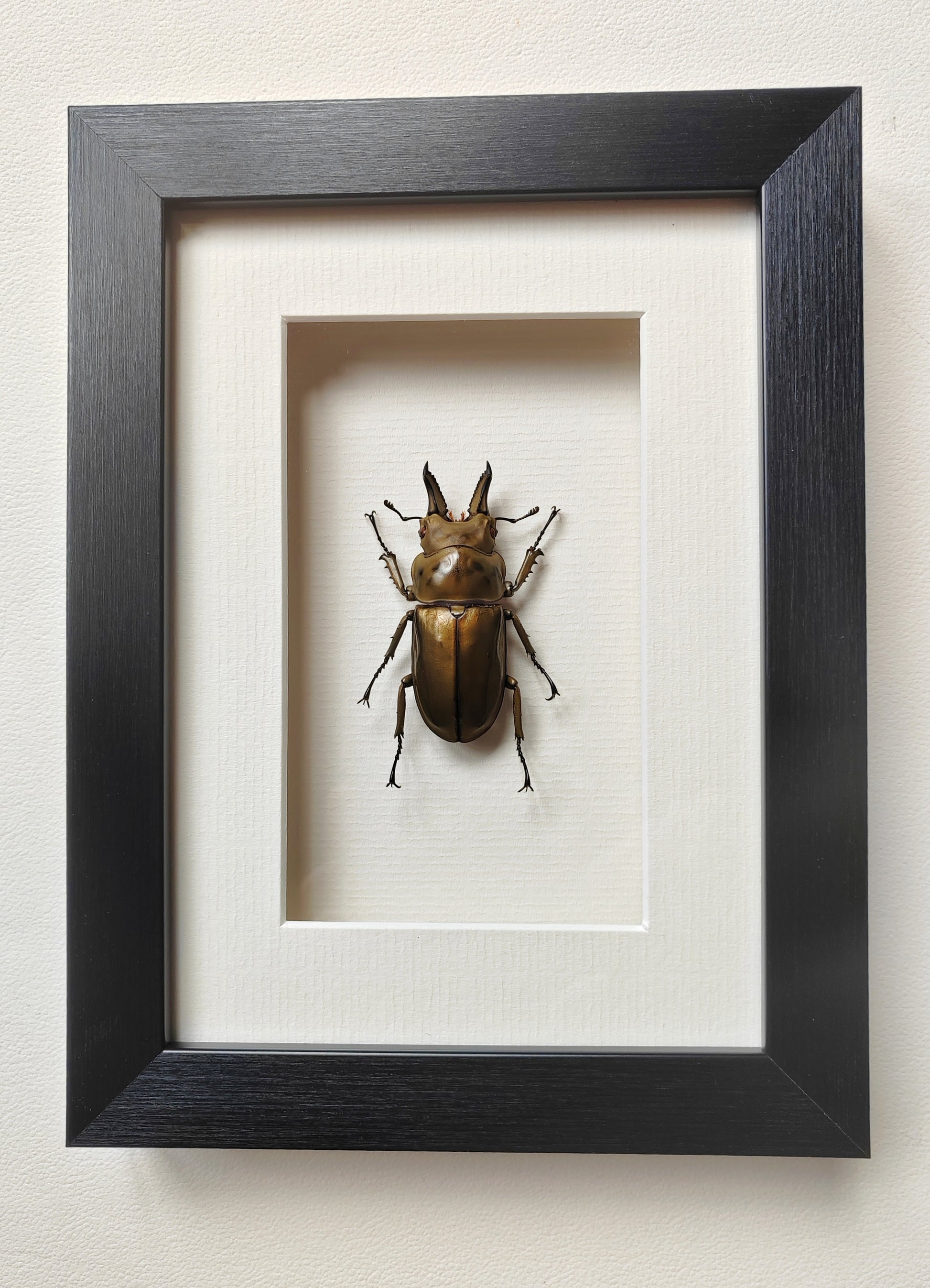 Allotopus rosenbergi, Golden Stag Beetle, male. Real framed specimen