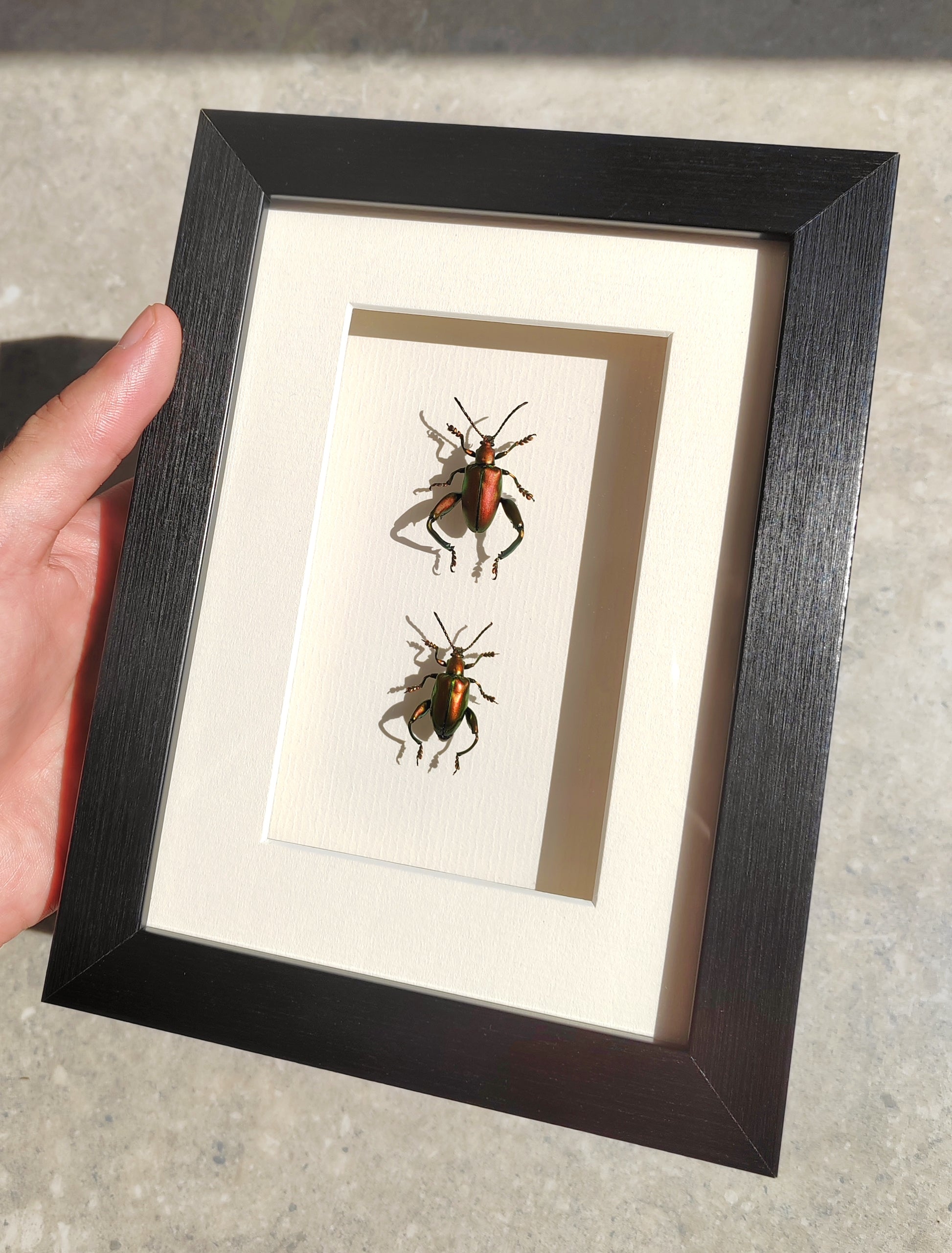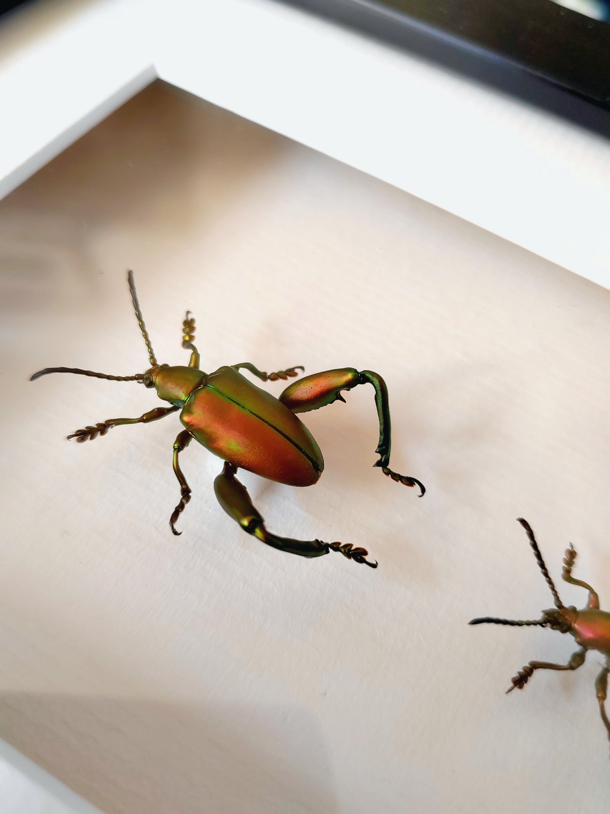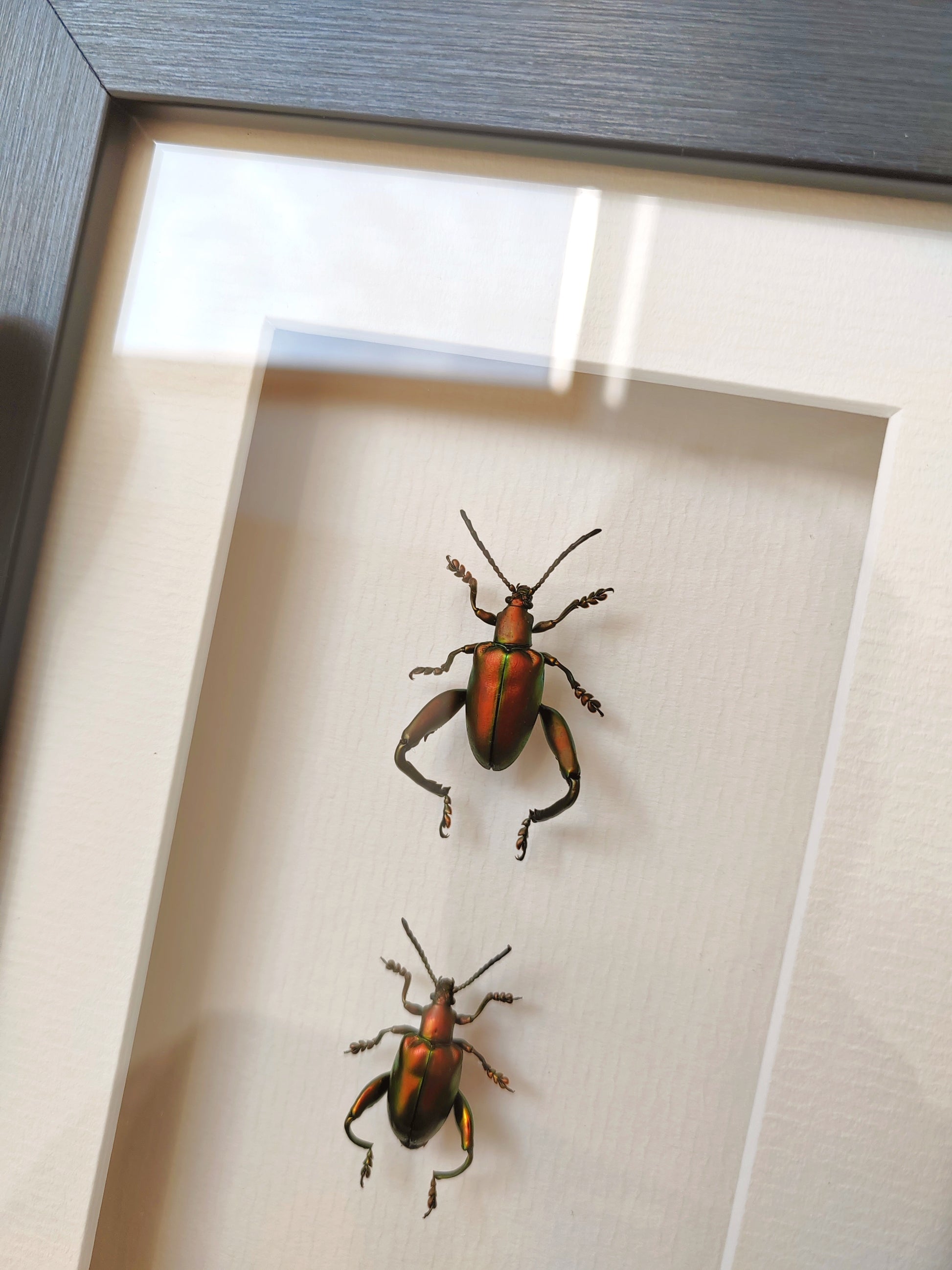 Sagra femoralis frog legged beetle, male & female pair real specimens framed